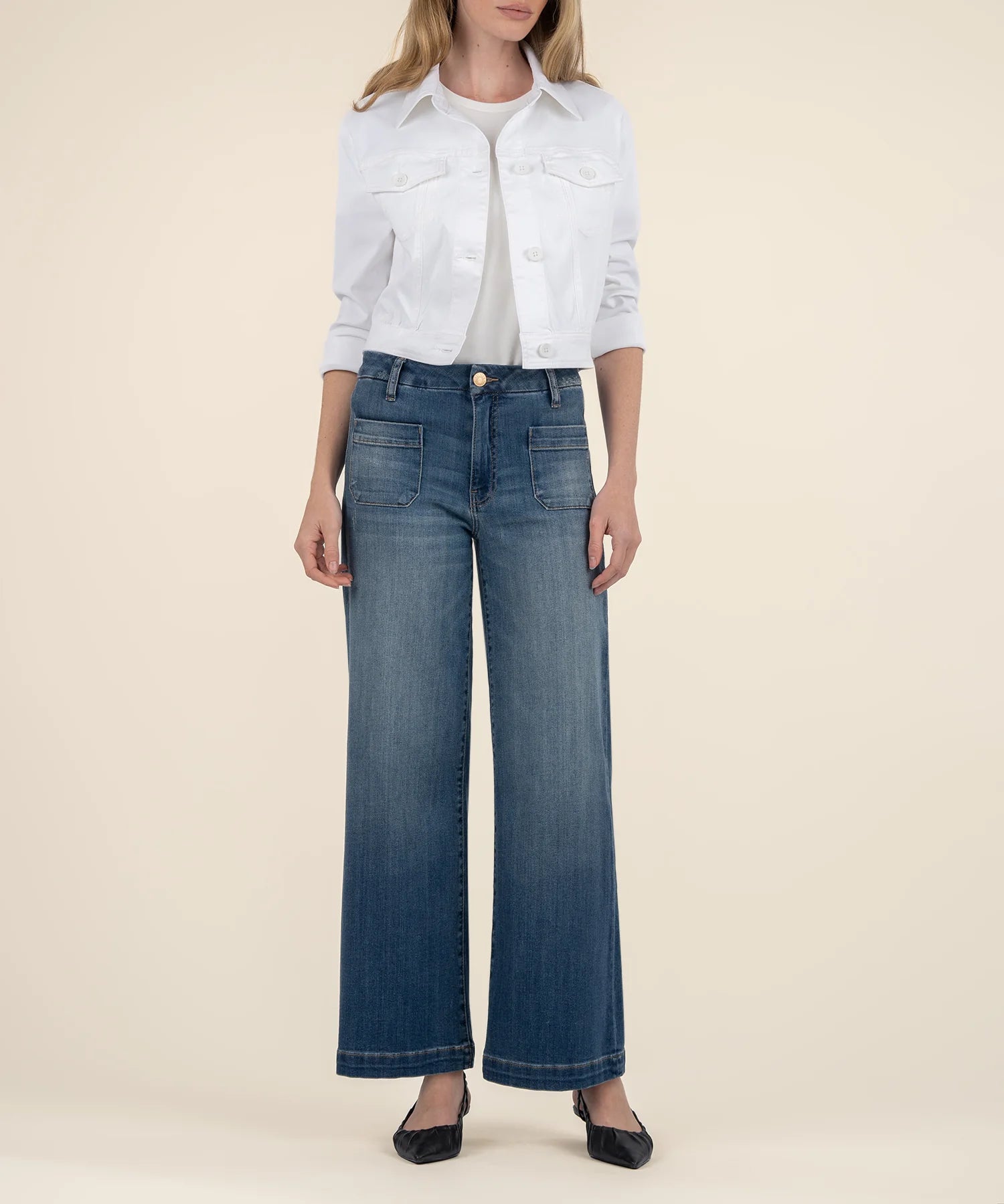 Top your look off with this slightly cropped white-denim jacket featuring detailed buttons and flap patch pockets.